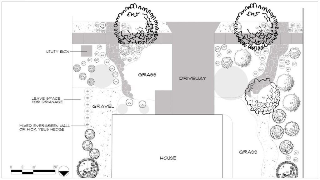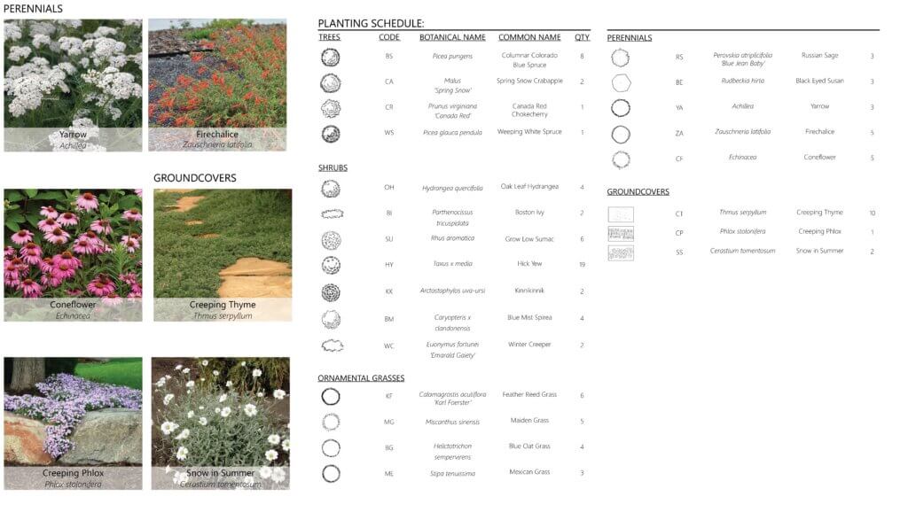 Planting Plan –  Placement of plants with symbols and quantities in the Planting Plan key.